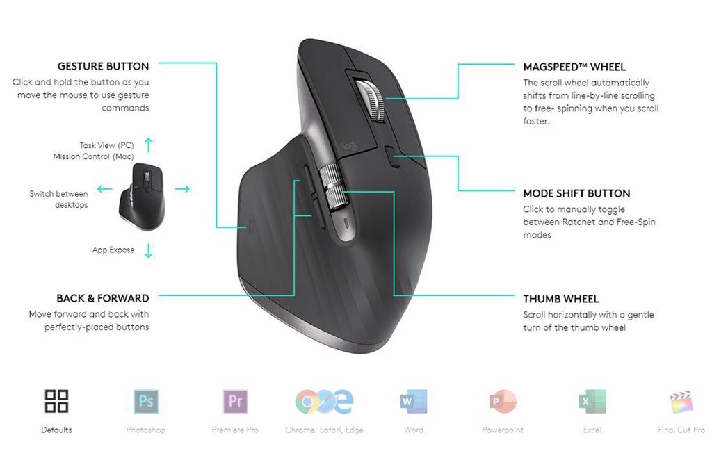 Khả năng tùy biến cùng đa dạng các cấu hình giúp chuột Logitech MX Master 3 Wireless trở thành một trợ thủ đắc lực trong các công việc văn phòng. Chuột Logitech MX Master 3 Wireless đem đến những tùy biến dành cho những công cụ như Adobe Photoshop, Adobe Premiere Pro, Google Chrome, Safari cùng các công cụ mật thiết đến văn phòng như Microsoft Word, Excel, PowerPoint.