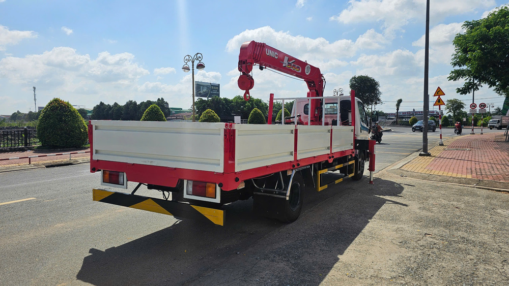 Cẩu thường được lắp phía sau cabin, giúp cân bằng tải trọng và tối ưu không gian thùng xe. Thùng xe có thể thiết kế theo nhiều dạng: thùng lửng, thùng kín hoặc sàn chở máy. Điều này giúp xe phù hợp với nhiều mục đích sử dụng khác nhau.