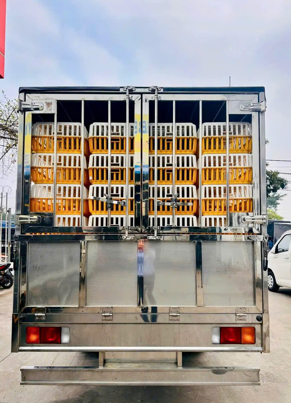 Phần thùng là điểm “ăn tiền” của xe. Thiết kế nhiều khe thoáng, có thể chia tầng hoặc bố trí lồng linh hoạt. Nhờ đó, gia cầm được đảm bảo thông gió, hạn chế chết ngạt khi vận chuyển đường dài. Đồng thời, việc bốc dỡ cũng nhanh gọn hơn.